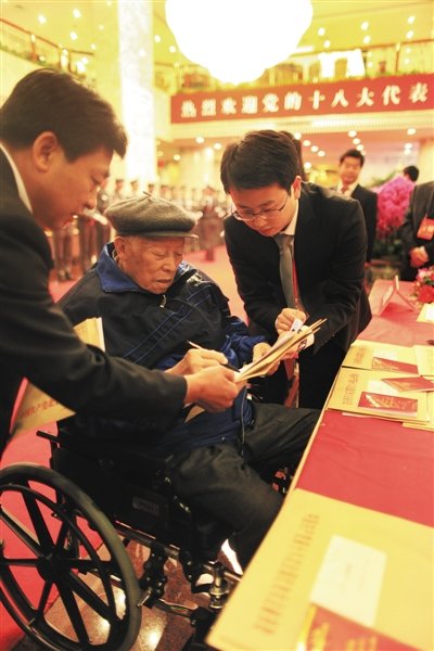 昨日下午,十八大代表中年龄最大的焦若愚到北京团报到。据报道,焦若愚1915年12月出生,1936年加入中国共产党,曾任北京市市长。昨日和今日,全国2200多名代表将陆续乘飞机、火车和汽车抵达北京参加大会。至昨日19时,已有十多个京外代表团陆续抵京。新京报记者 浦峰 摄