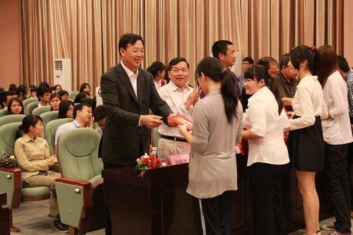 此外,陈院长还对在场的各位学子们提出了两点要求:一是作创造华商良好学风和校风的践行者,能为华商良好校风和学风的建设做出贡献。陈院长讲述了他对学风校风的定义:一个良好的学风应该是关注社会、关注集体、关注他人。华商的学生,在尽责任的同时,也要履行义务。所谓责任,就是要努力学习,积极向上;所谓义务,则是关心祖国、热爱祖国、关心社会、关爱集体、关注他人;总而言之,就是要有社会责任感。希望华商的学生能够走出社会,关注社会,关注他人。二是遵纪守法、努力学习,积极向上。讲话中,陈院长生动引证,论述了院领导对于遵纪守法这一方面的具体要求,在注重安全方面,希望每位共产党员、共青团员、学生干部能够站出来抵制各种违法行为,为学生自身的安全着想。在学习方面,每位学生要集中精神,要专心学习,要珍惜学习的机会,要调整好自己的心态。希望学子们能够承担起建设华商良好学风和校风的践行者,为华商的未来和明天的发展做出贡献。