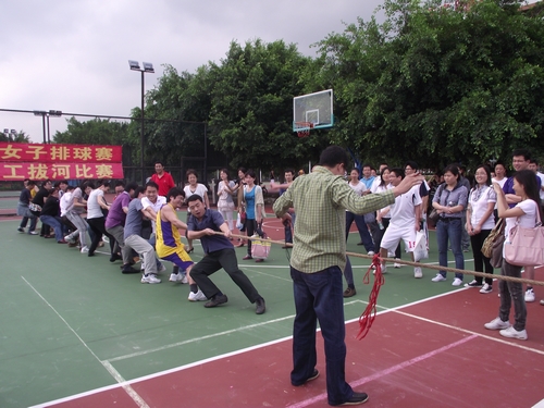 当天下午天气晴朗,清风拂面。赛会工作人员早早抵达现场进行准备工作,参加拔河比赛的教工们也纷纷到场。有些教工更是全家出动,为参加比赛的家人呐喊助威。伴随声声哨响,一场场别开生面的比赛随即展开。平日里在讲台或办公室衣冠齐整的教工,此时为了各系部的荣誉暂时撇开“形象”,一起咬牙使劲往后拔。在旁边观战的同事、亲友团也没闲着,拍照、录像、擦汗、递水,让整场拔河比赛充满了温馨和睦的氛围。