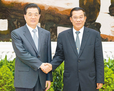 胡锦涛表示,中柬友好源远流长。建交半个多世纪以来,两国领导人共同缔造和精心培育的中柬友谊经受住了时间和国际风云变幻考验。两国建立了全面战略合作伙伴关系,彼此高度信任、真诚合作、坚定支持、共同发展。中方赞赏洪森首相一向重视发展对华关系,长期以来在重大问题上坚定支持中方,为中柬关系发展作出了重要贡献。