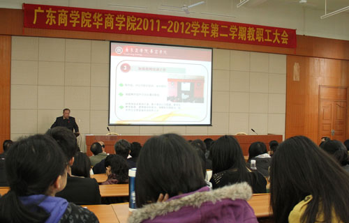 会上,陈院长首先阐述我院2011年取得的主要成绩。一是顺利通过了学士学位授权单位评估,二是教学教育质量得到了全面提升,三是专业建设和师资队伍建设进一步加强,四是办学条件有了进一步改善,五是良好的学风、教风逐步形成,六是培养了一批教学与管理骨干队伍,七是招生、就业工作取得了可喜成绩,八是学校的社会认可度进一步提升,尤其是学士学位授予权评审的通过。陈院长指出,这些成绩是学校发展的一座里程碑,更是学校给学生与家长的一份满意答卷。专业的定位,教师队伍的壮大,图书馆的藏书之丰,就业率的高额满意度和所获得民办优秀院校的荣誉称号,都证明了华商正走在教学规范化的道路。