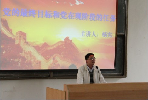 在励志楼B208,团委书记杨宪老师主讲“党的最终目标和现阶段的任务”。杨老师首先阐明共产主义社会与人类社会历史发展的规律,说明了党在现阶段的任务是建设有中国特色的社会主义,对学员们提出了要做一个合格的大学生的要求;其次是要求学员们自觉学习理论,坚定共产主义理想信念;最后鼓励学员们投身于建设有中国特色社会主义事业,为实现共产主义奋斗终身。在讲座最后,杨老师希望在座的每一位学员都认真学习党的基本知识,争取早日加入党组织!