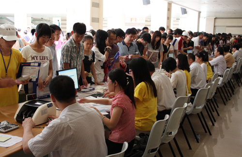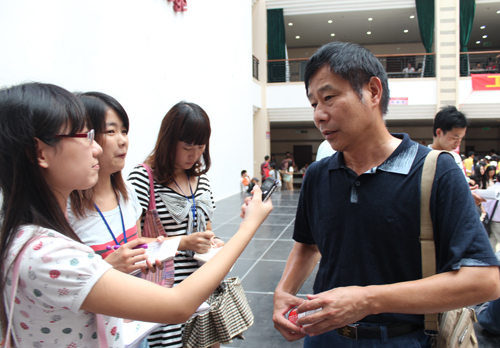 上午10点左右,中央图书馆内迎来了第一个新生报到高潮,来自各地的家长和大一新生在迎新志愿者的引导下,有条不紊地办理注册登记、宿舍安排、缴费登记、办理IC卡、核准学籍信息等各项手续。高峰持续到下午1点左右,在各系大本营、接待点都是陆陆续续来报到的新生,尤其是中央图书馆内人头攒动。站在一旁的执勤人员说:“今天我主要是负责疏通通道,维持秩序的,虽然辛苦,但看到这些刚踏进大学的孩子,自己也挺开心的。”