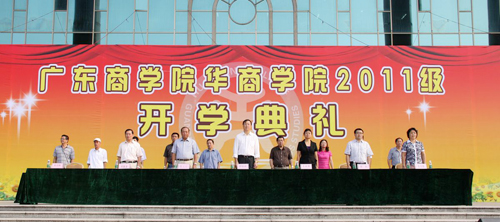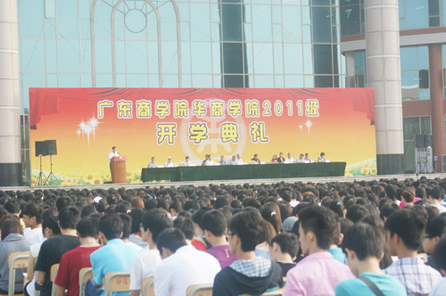旭日初升,阳光普照,年轻华商,活力四射。2011年9月7日上午,广东商学院华商学院2011级新生开学典礼在中央图书馆广场隆重举行。广东省政协常委、华商学院董事长廖榕就博士,广东商学院副校长王廷惠教授,博士生导师、学院院长陈玉川教授,党委黄虹书记、副院长邓基泽副研究员,副院长支戈壁副教授、副院长张方林教授及各系部主任出席了本次开学典礼。典礼由张方林副院长主持。