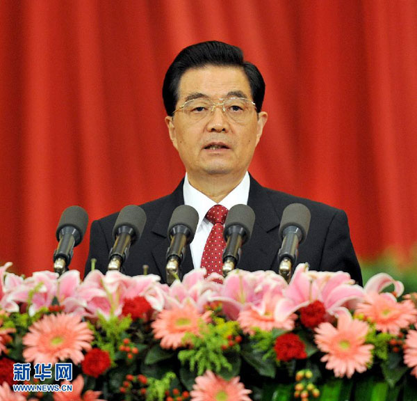 10月9日,纪念辛亥革命100周年大会在北京人民大会堂隆重举行。中共中央总书记、国家主席、中央军委主席胡锦涛在大会上发表重要讲话。新华社发
