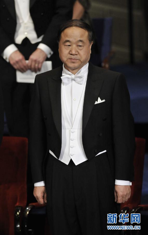 12月10日,在瑞典首都斯德哥尔摩音乐厅举行的2012年诺贝尔奖颁奖仪式上,中国作家莫言从瑞典国王卡尔十六世·古斯塔夫手中领取诺贝尔文学奖。