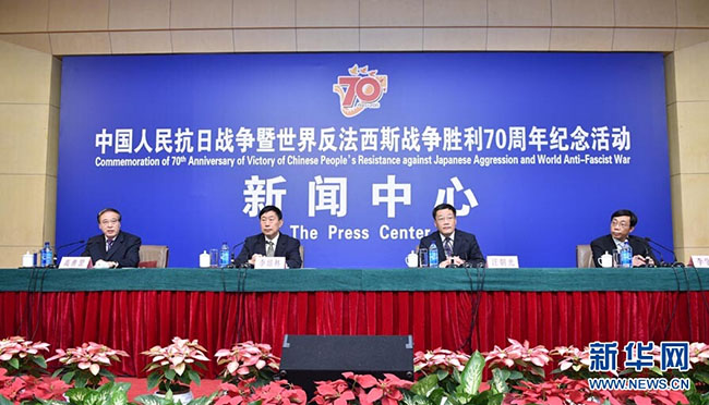 8月28日上午10时,抗战胜利70周年纪念活动新闻中心邀请中国社会科学院副院长李培林,近代史研究所副所长汪朝光,近代史研究所研究员李学通介绍中国人民抗日战争胜利的伟大历史意义等方面情况。图为发布会开始。新华网郭小天 摄